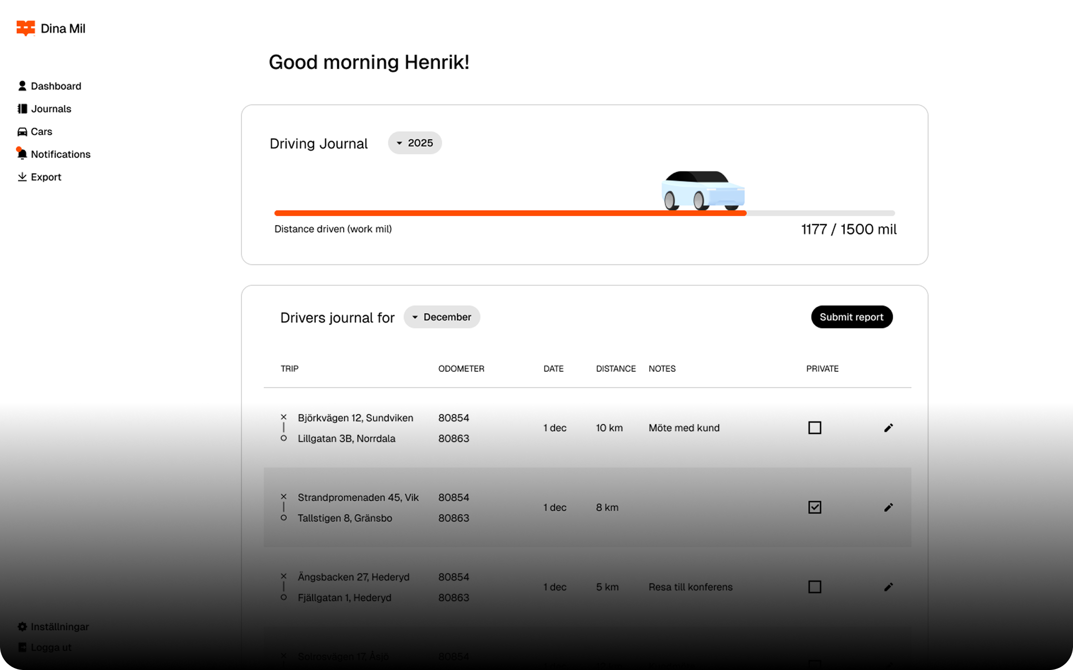 As a driver, you need to add the purpose of the trip and then you're done. In the event of a possible inspection by the Swedish Tax Authority, you just need to export the milage log and submit it.