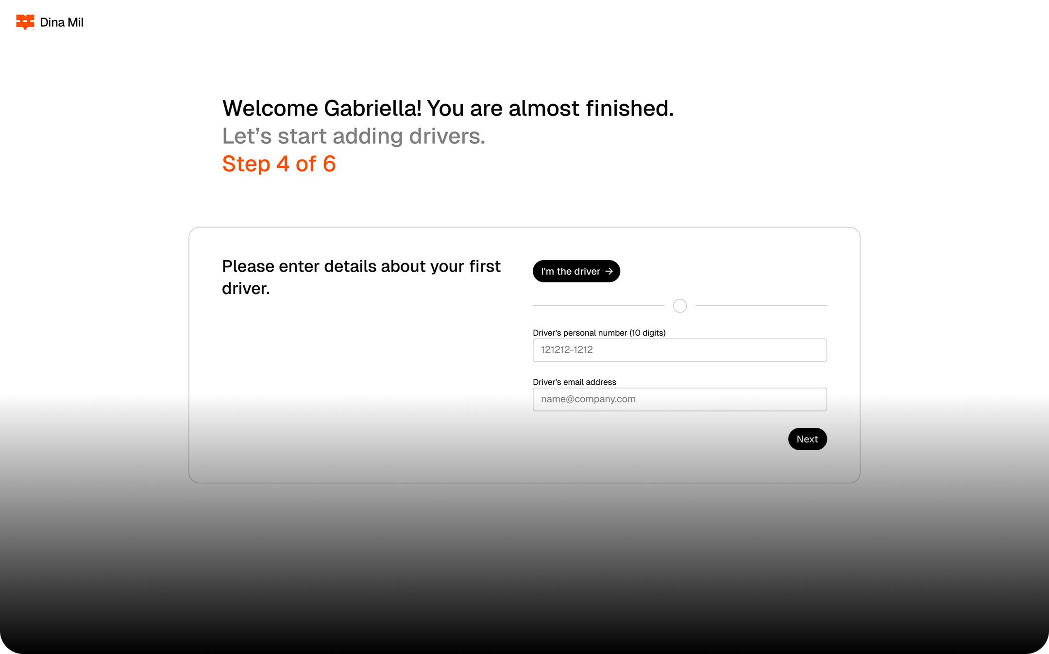 You can choose to add all drivers during onboarding, or add more at a later time. Once the drivers have been added to your fleet, they will receive an email invitation from Dina Mil with a link to complete their individual registration.